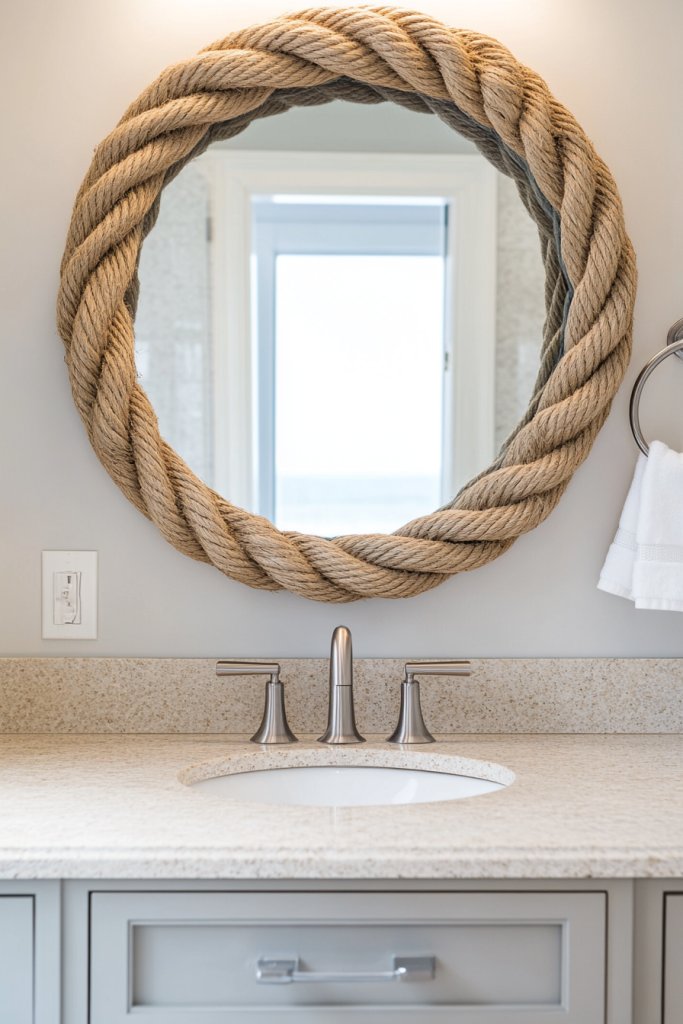 Mirrors are more than just functional; they can be statement pieces that elevate your entire bathroom decor. Nautical-inspired mirrors with rope frames bring a playful yet sophisticated coastal touch. They subtly tie the theme together and add visual interest. Who wouldn’t want a mirror that reflects seaside charm?