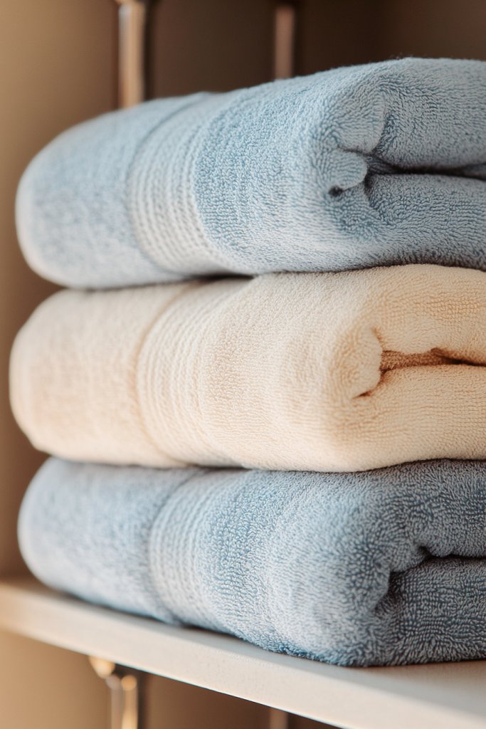 Choose high-quality linen or linen-blend towels that maintain softness after multiple washes. Wash before use to enhance softness and remove excess lint. Hang on sturdy, rust-resistant hooks or bars to prevent stretching. Wash regularly with gentle detergent to preserve their plush feel. Store in a linen closet or basket for an organized look.