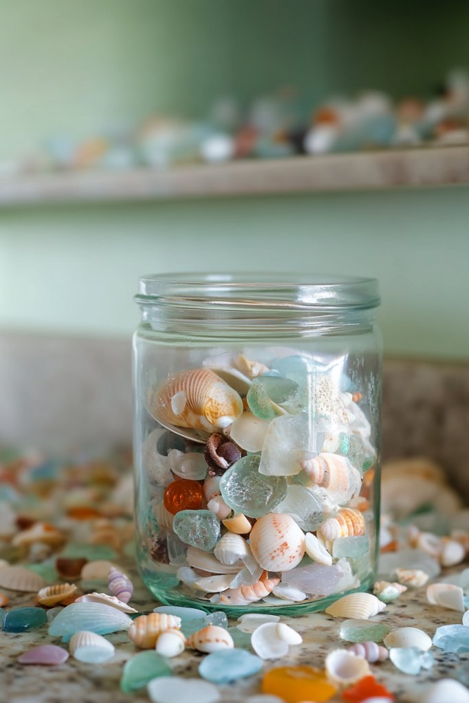 Choose jars in different sizes and shapes, from vintage apothecary bottles to modern cylindrical containers. Fill them with seasonal treasures, like starfish or coral, to keep the decor fresh. Use metallic or colored lids to add a pop of contrast. For a more curated look, group several jars together and vary their contents.