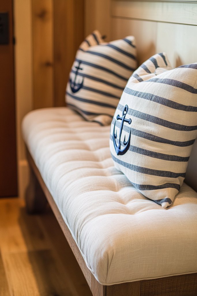 15. Linen-Covered Bench with Nautical Throw Pillows