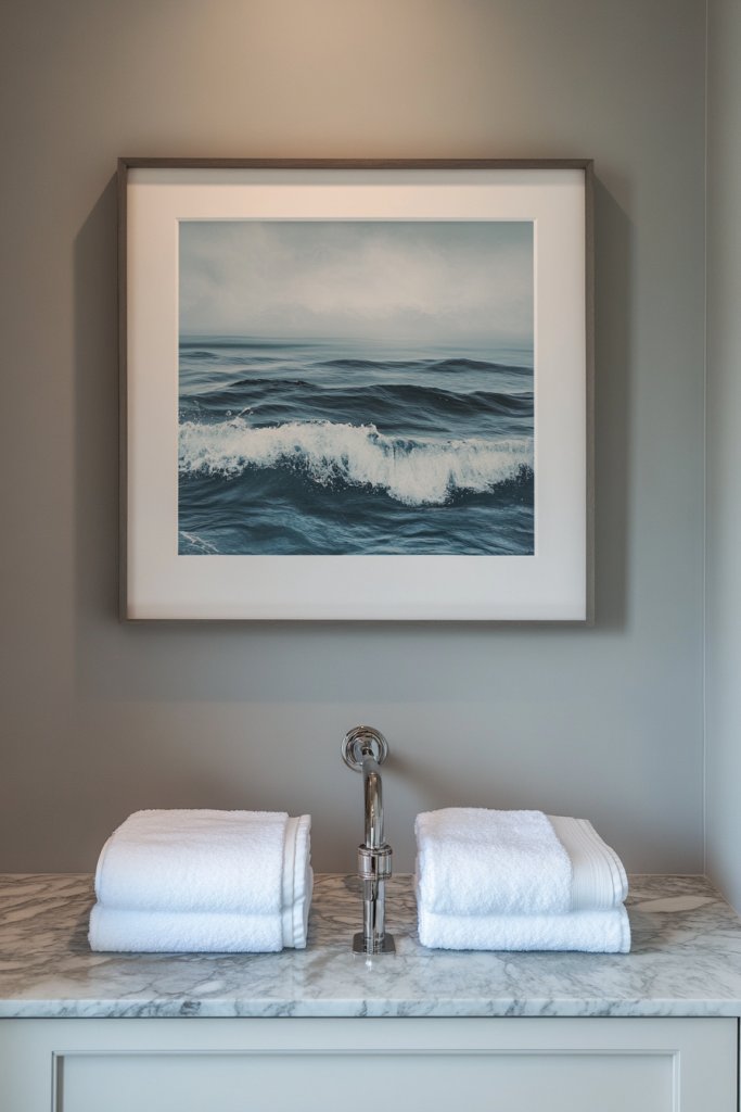 Blank walls can make a bathroom feel cold and uninviting. Coastal-inspired wall art, especially abstract ocean scenes, adds personality and depth without overwhelming the space. It’s a subtle way to bring the sea inside and evoke a sense of calm. Who wouldn’t love a splash of artistic tranquility?