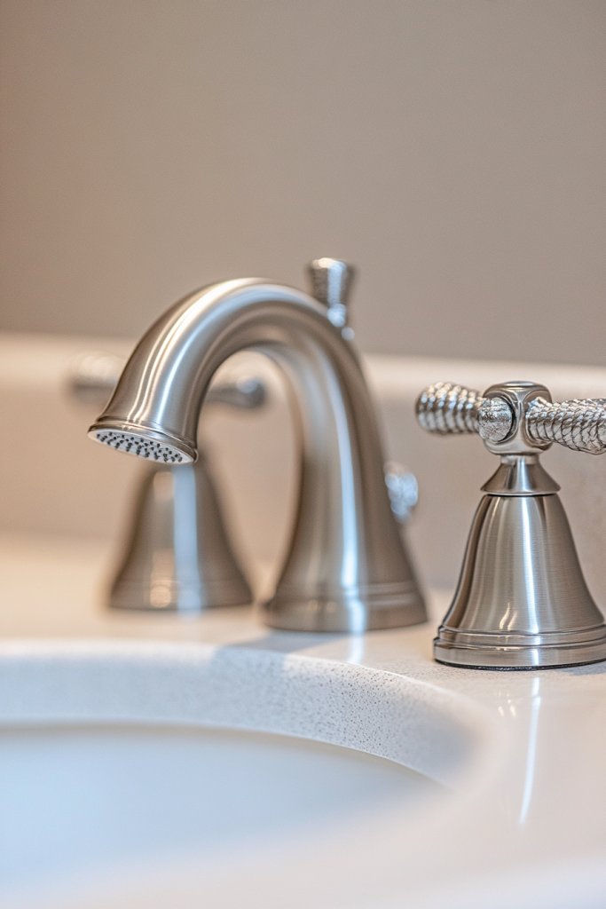 Picture brushed nickel faucets with a sleek, modern profile, complemented by handles shaped like ship’s wheels or anchors. The fixtures subtly evoke maritime charm while maintaining a contemporary feel. The consistent finish and style create harmony, making the entire space feel thoughtfully curated. The overall look is refined, relaxed, and cohesive.