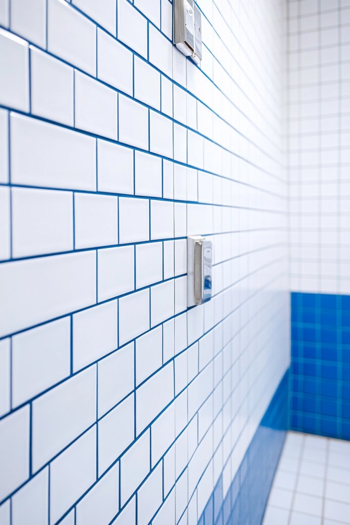 Visualize a bathroom with crisp white subway tiles covering the walls, interrupted only by thin, vibrant blue grout lines. The glossy surface reflects natural light, making the space feel larger and brighter. Complement the tiles with a simple white vanity and chrome fixtures for a sleek, polished look. A soft, sandy-colored rug grounds the space, enhancing the coastal vibe.