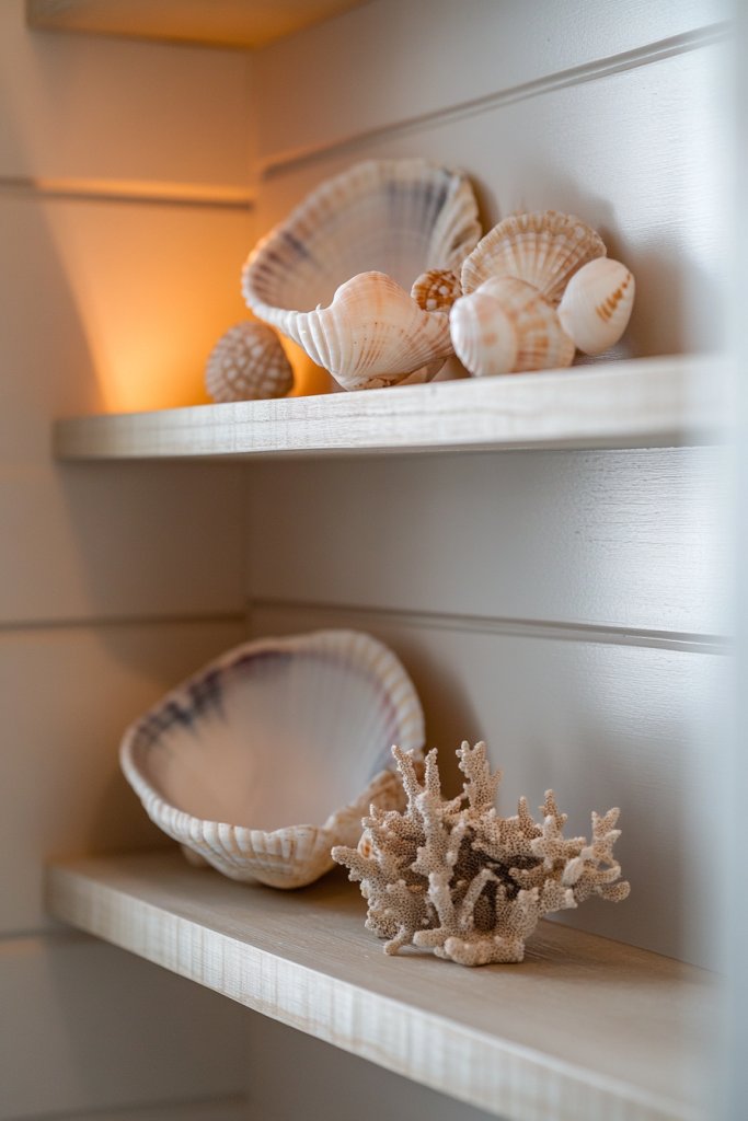 Picture floating wooden or white-painted shelves holding neatly arranged woven baskets, seashell collections, and coral pieces. The open design keeps everything within reach and visually appealing. Soft lighting above or underneath adds warmth, highlighting your decor. This setup creates a layered, textured look that feels relaxed yet curated.