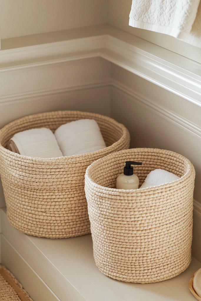 Visualize open shelves or under-sink storage filled with natural fiber baskets in shades of tan, white, or gray. They nestle neatly, hiding away clutter while adding an organic touch. The woven texture contrasts beautifully with smooth tiles or painted walls. The soft, natural tones evoke a relaxed seaside ambiance.