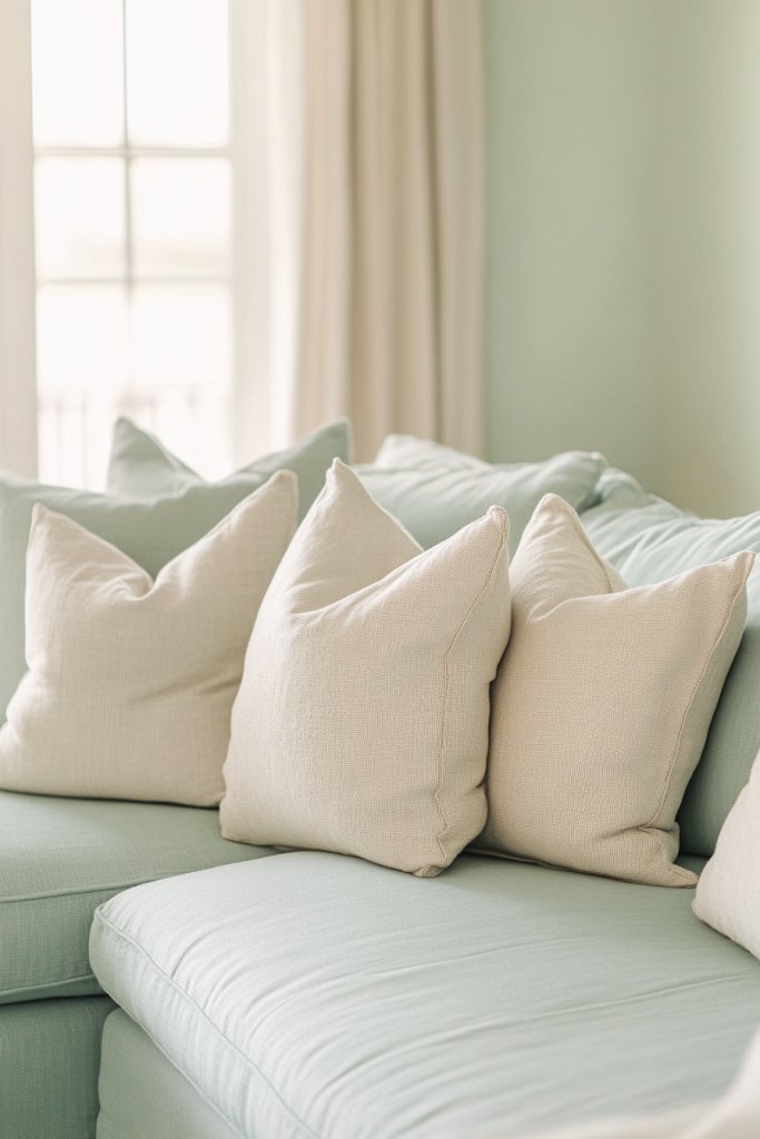 Mix and match pillows in different sizes and shapes for a layered look. Incorporate pastel shades like blush pink or soft aqua for a more subtle coastal vibe. Seasonal updates can include brighter colors or patterned covers with starfish or coral motifs. Use removable covers to change styles easily, matching your mood or decor updates. Keep the fabric choices breathable and washable for practicality.