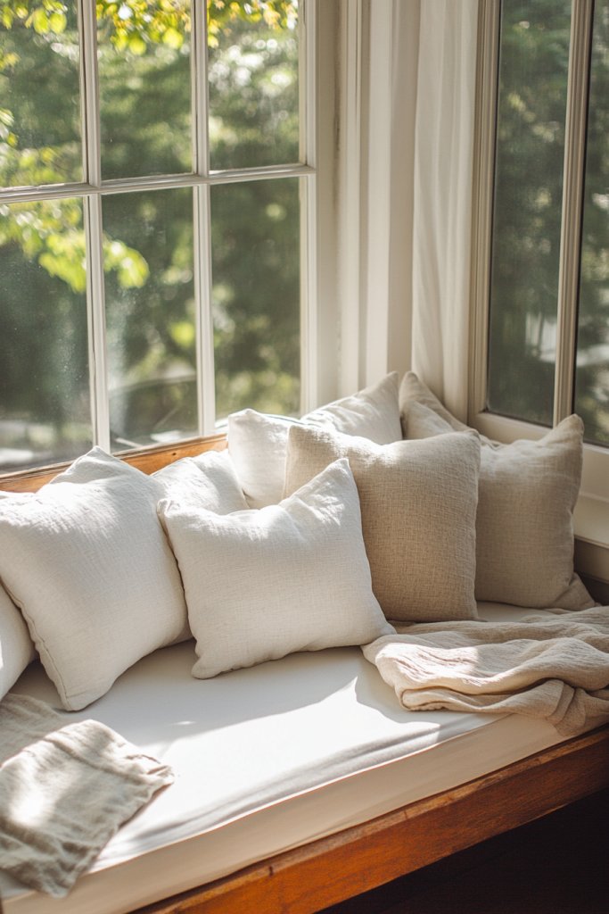 Picture a corner bathed in soft sunlight, with a plush daybed dressed in linen or cotton slipcovers. Cushions in coastal shades and textured throws add layers of comfort. The space feels intimate yet open, with a view to the outdoors or a scenic window. Natural fibers, light wood, and subtle patterns complete the inviting, relaxed atmosphere.