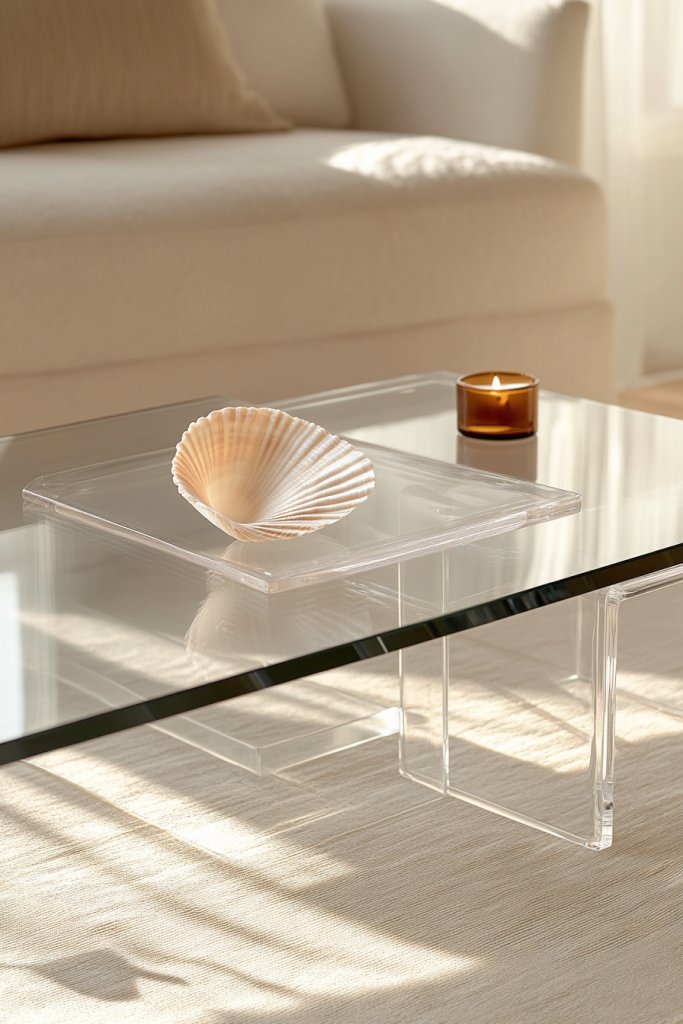 Use acrylic or glass furniture in small spaces to create a sense of openness, or choose statement pieces like a glass coffee table. Incorporate transparent accessories such as trays or decorative objects that don’t compete with other decor. Mix with natural fibers and light wood to maintain a coastal vibe. Seasonal styling can include glass cloches or acrylic sculptures for added interest.