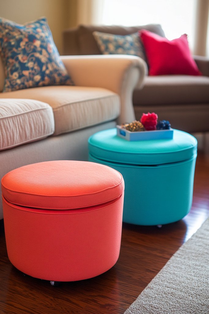 Choose ottomans in bold colors like aqua, coral, or sunny yellow for maximum impact. Mix with neutral furniture for a balanced look, or coordinate with other accessories like cushions or throws. Use different shapes—round, rectangular, or cube—for visual interest. Seasonal updates can include covers in different shades or patterns. They work well in family rooms, sunrooms, or outdoor patios.