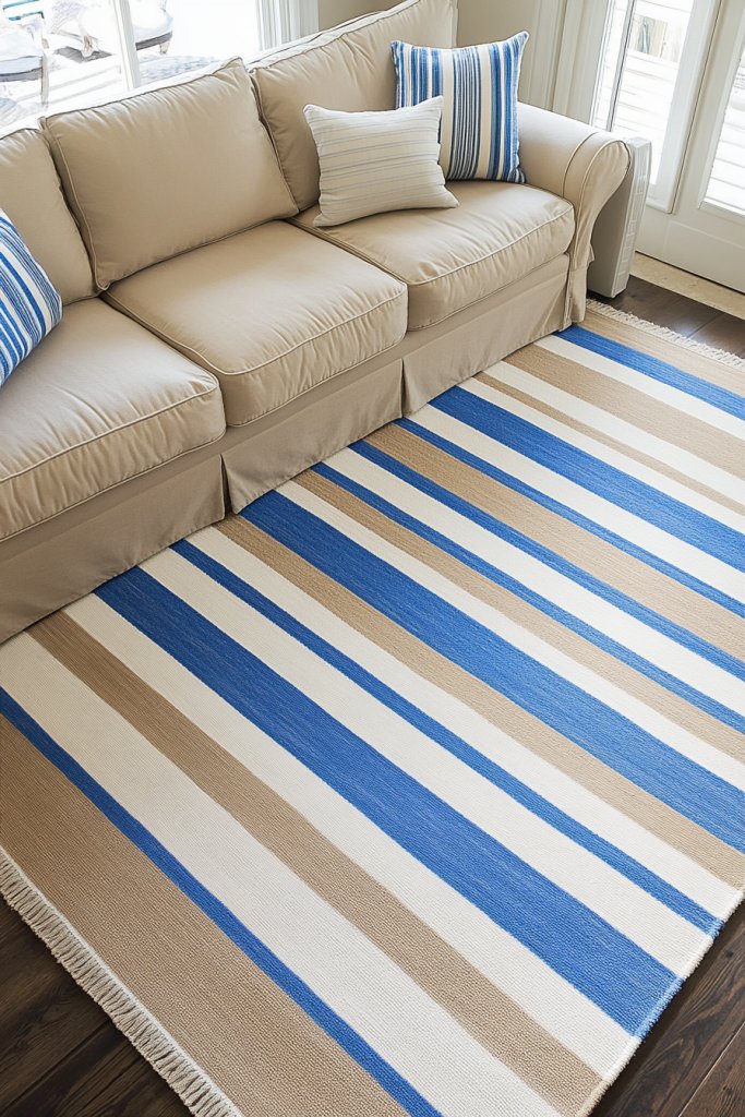 Bright striped rugs instantly energize your living room and create a welcoming, playful atmosphere. They’re versatile and timeless, suitable for both casual and more refined coastal themes. With a little effort, your space can feel vibrant, cozy, and full of seaside charm, no matter the season.
