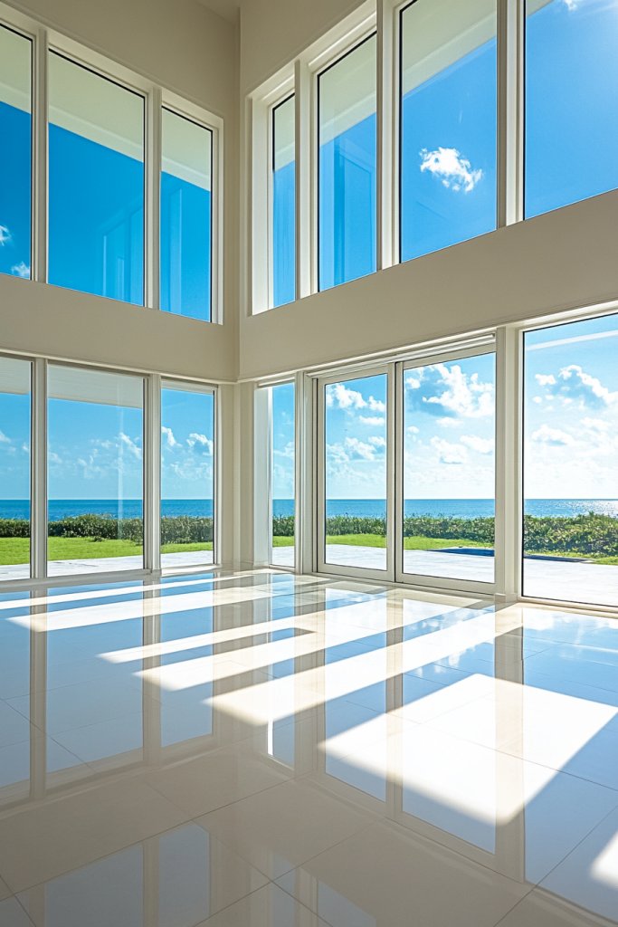 Picture expansive glass doors opening onto a patio, with sunlight pouring into a room painted in soft coastal hues. The space feels open, fresh, and connected to nature. Light bounces off white walls and reflective surfaces, amplifying the glow. The view outside blends seamlessly with the interior, making the room appear larger and more vibrant.
