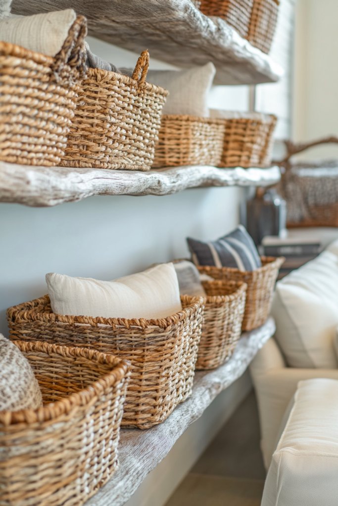 Mix open shelving with closed storage to hide clutter while displaying decorative items. Use woven baskets or fabric bins in sandy or pastel shades for seamless integration. For smaller spaces, furniture with built-in storage keeps things tidy. Seasonal swaps of baskets or decorative containers refresh the look. Incorporate sculptural storage pieces like driftwood-inspired boxes for a unique touch.