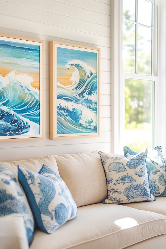 Want to add visual depth and personality without cluttering your space? Ocean-inspired artwork or prints bring the beauty of the sea into your living room. They enhance the coastal theme, creating a focal point that’s both calming and inspiring. If you’re looking for a quick decor upgrade, this is it.