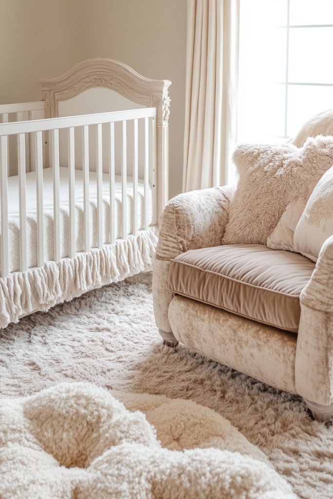 This palette suits all seasons, with lighter shades feeling fresh in summer and richer tones adding warmth in winter. For a more gender-neutral look, stick to taupe and cream, or add a pop of pastel for a gentle touch. If space is tight, focus on layering textiles for warmth without cluttering the room. You can also swap plush textures for quilted fabrics or soft faux furs to vary the cozy feel.