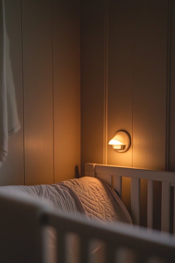 Picture a gentle glow cast by a small, dimmable lamp or a collection of nightlights in warm tones. The light is soft enough to see clearly but not harsh or glaring. You might also have lantern-style fixtures or wall-mounted sconces with adjustable brightness. The dimming feature allows you to tailor the ambiance for different routines, from feeding to sleeping.