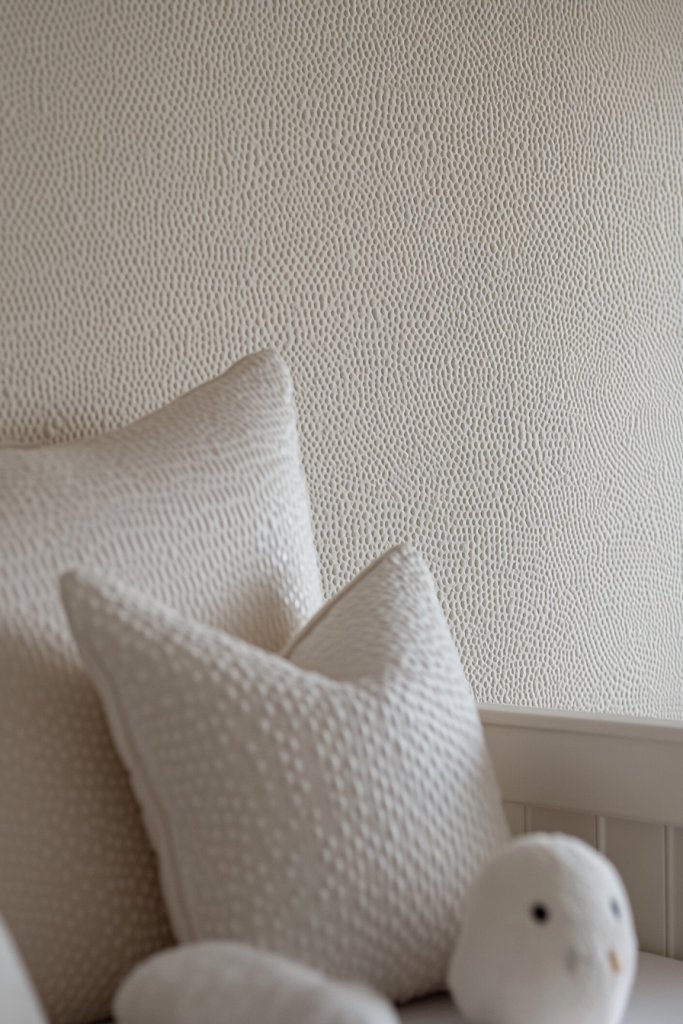 Imagine walls adorned with soft, tactile wallpaper featuring gentle patterns like subtle waves, embossed dots, or linen textures. The textured surface catches light differently throughout the day, creating a dynamic visual effect. The pattern adds depth without clutter, making the room feel cozy and sophisticated. The neutral tones serve as a perfect backdrop for other decor elements.