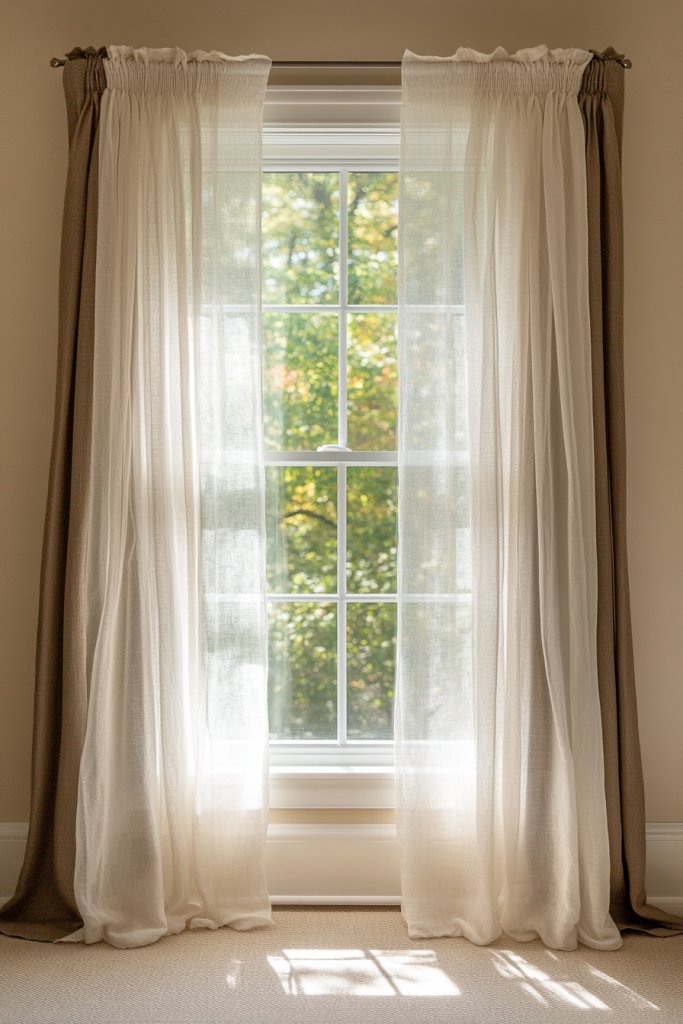 Picture a set of layered curtains—sheer, airy fabrics paired with thicker blackout drapes in coordinating shades. When open, the room is bathed in natural light, and when closed, it feels cozy and private. The layered look adds visual depth and softness, framing your window like a delicate piece of art. The fabrics flow gently, creating a calm, gentle backdrop.