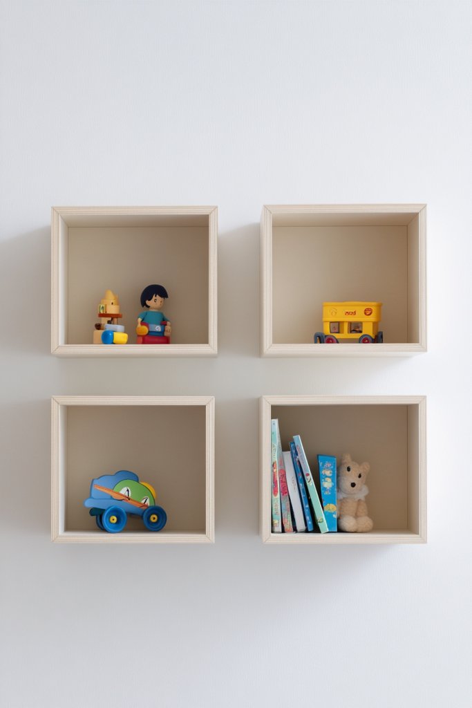 Envision fabric-lined wall cubes arranged in a grid or staggered pattern, painted in soft, coordinating shades. Plush toys and small baskets fill the cubes, creating a colorful, inviting display. The open design allows kids to see and access their favorite items easily. The arrangement adds visual interest and keeps clutter off the floors.