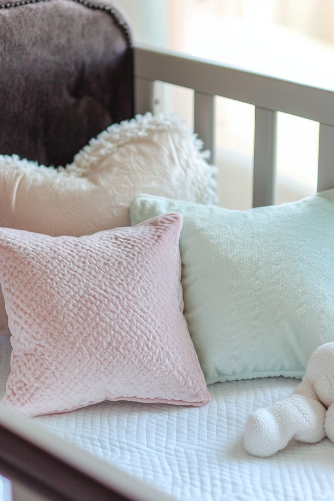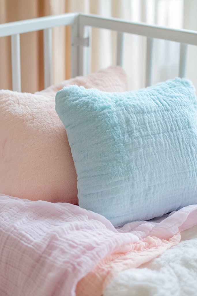 Mix different textures—knit, faux fur, velvet—for visual interest. Keep pillows in safe, washable fabrics that are gentle on delicate skin. Use themed loveys or matching pillow covers to tie into your nursery’s decor. For a seasonal touch, swap out pillow covers or add small plush toys.