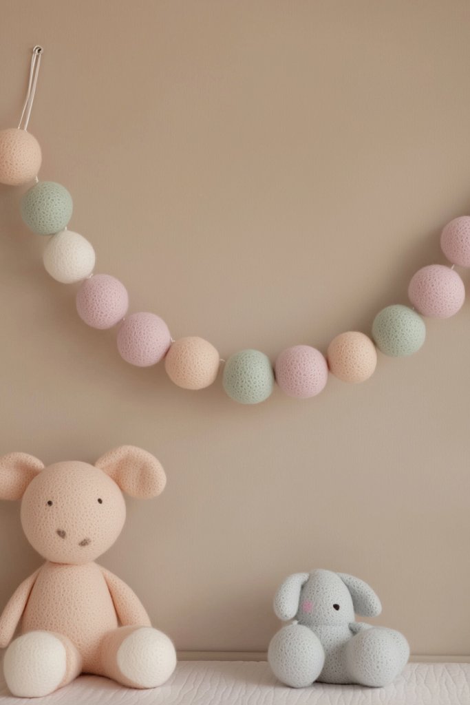 Imagine a string of colorful felt balls in soft hues, draped across a feature wall or above the crib. The balls are in varying sizes and colors, creating a playful, textured visual. As light hits the felt, it subtly changes color and casts gentle shadows, adding depth. The garland adds a handmade charm that brightens the space.