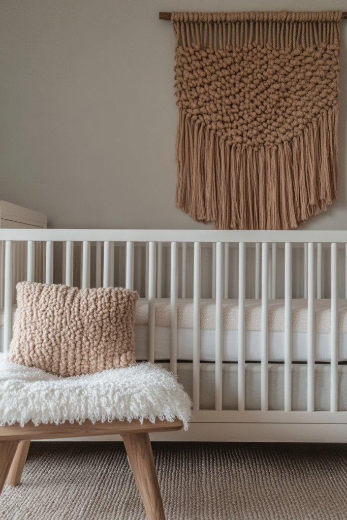 Picture soft blankets draped over the crib, chunky poufs in cozy textures, and loveys with intricate knitting patterns. The tactile quality invites little hands to explore and cuddle. Warm yarns in muted or pastel shades add depth and character. These handcrafted details make the nursery visually rich and inviting.