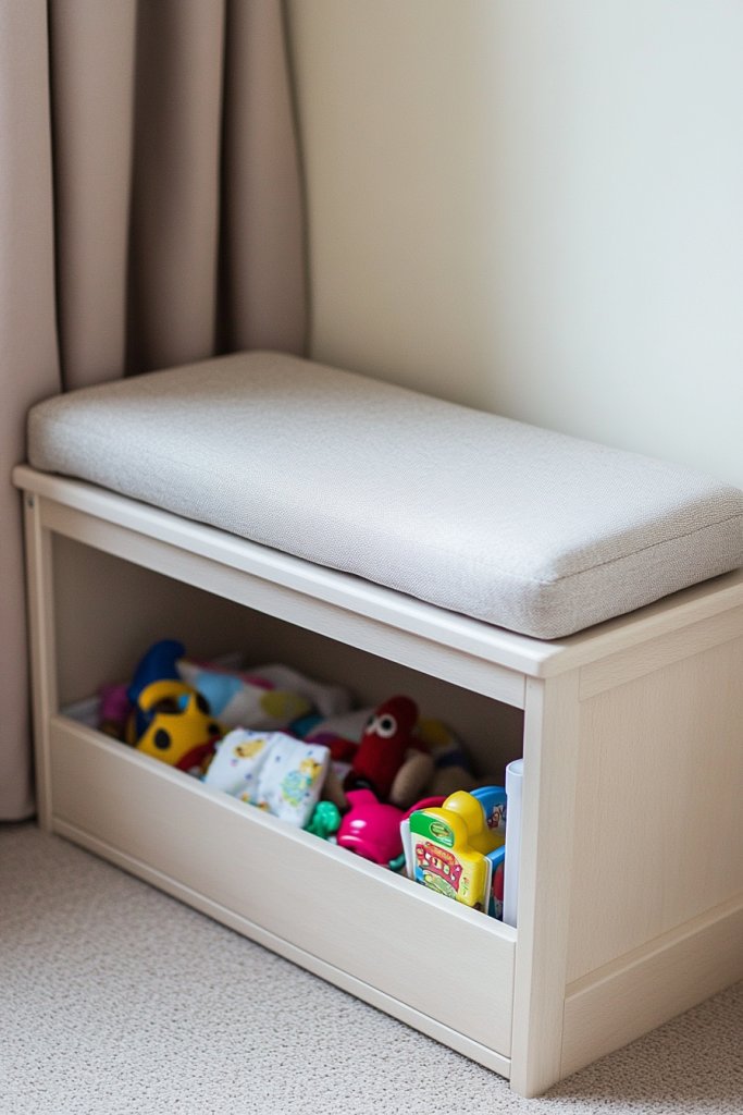 Imagine a sleek wooden bench placed against a wall, topped with a plush cushion in a coordinating fabric. It doubles as a comfy seat for storytime or diaper changes, while the space inside hides away toys, blankets, or extra clothes. Soft fabric bins or baskets sit neatly within the bench’s compartments, keeping everything accessible yet tidy. The overall look is inviting, functional, and effortlessly stylish.