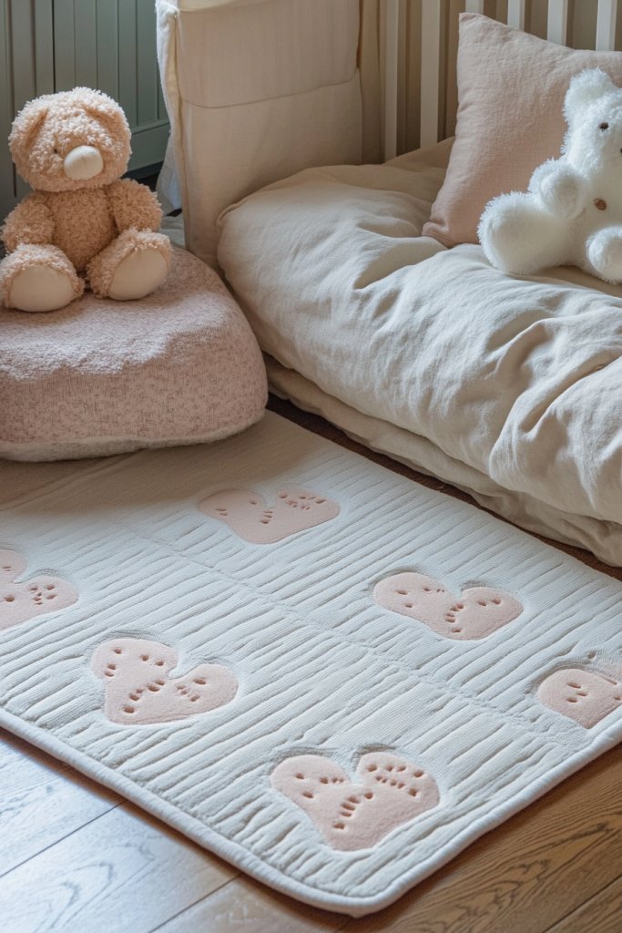 Visualize a large, textured area rug in plush fibers covering most of the nursery floor. Layer smaller rugs or mats in coordinating colors or patterns for visual interest and added softness. The tactile layers invite children to crawl or sit comfortably. Footprints or paw prints in contrasting colors can add playful charm, making the space lively and cozy.