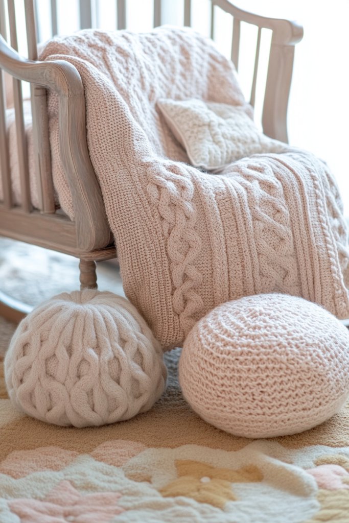 Start with soft, non-synthetic yarns in soothing tones. Knit or purchase handmade blankets, loveys, and poufs. Place larger items like blankets on the crib or rocking chair, while smaller accessories can decorate shelves or changing tables. Regularly wash and maintain knitted pieces to keep them soft and fresh. Incorporate textured knitting patterns for visual interest.