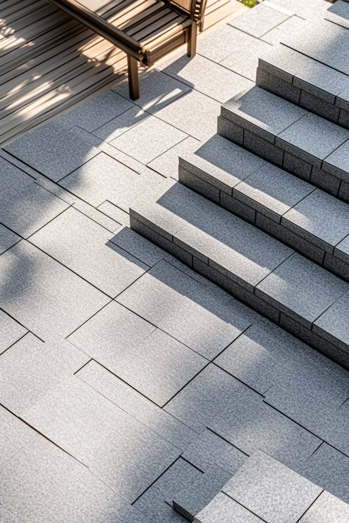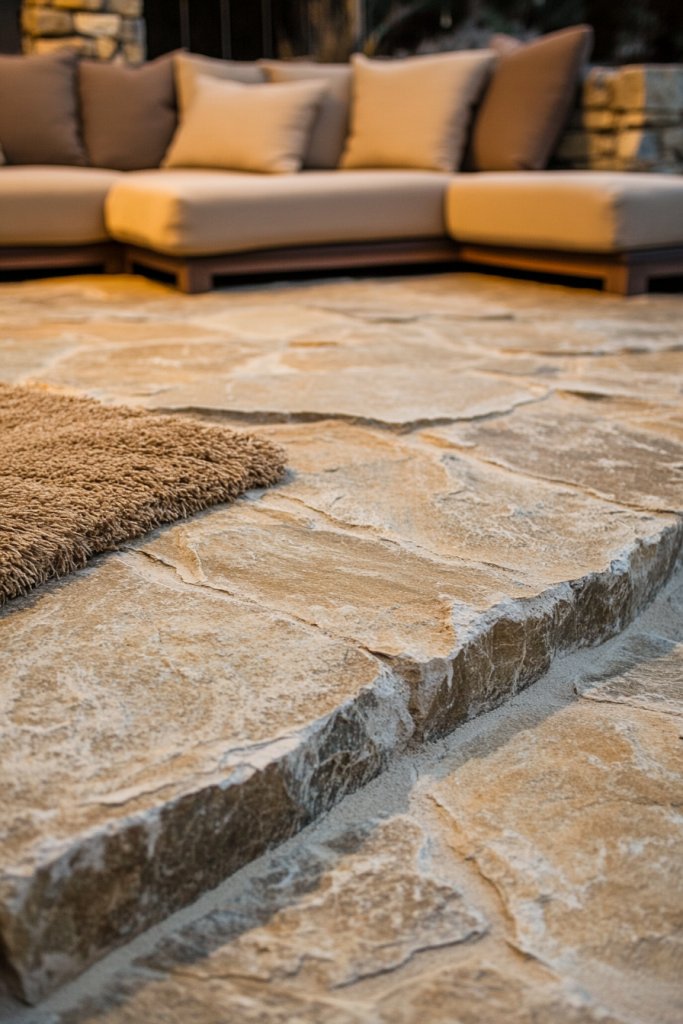 Picture large flagstone or slate slabs laid out in irregular shapes, their earthy tones contrasting beautifully with vibrant cushions and throws. Soft, weather-resistant rugs in warm hues or textured patterns add comfort underfoot. The stones’ rough texture and natural variations create a rustic charm, while the plush rugs soften the visual and tactile experience. String lights or lanterns cast gentle glows, emphasizing the natural beauty.
