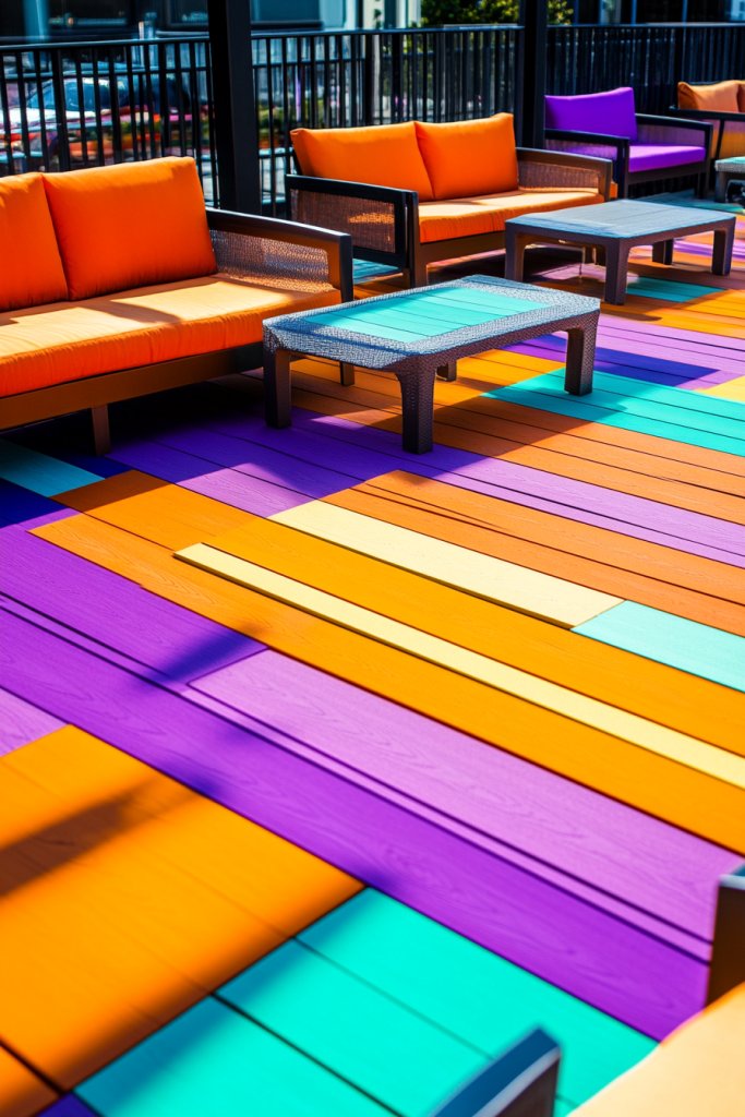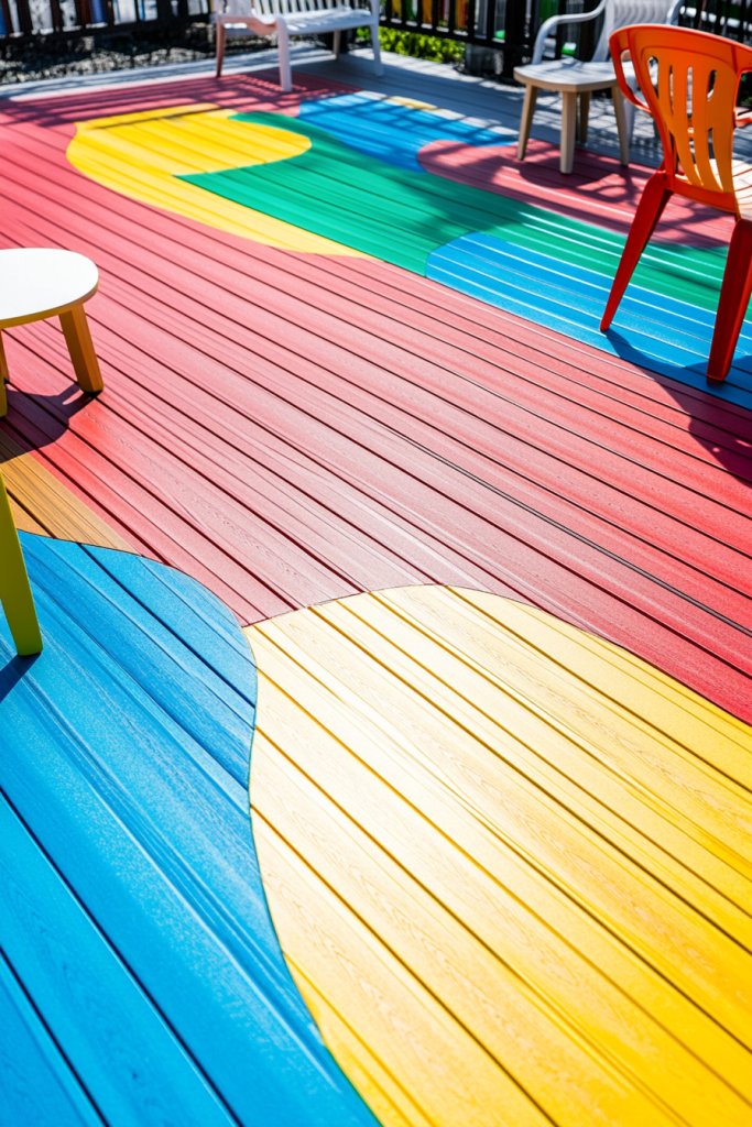 Imagine a deck with planks stained in a spectrum of bold colors—teal, orange, purple, and yellow—arranged in a pattern or rainbow gradient. The colors pop against lush greenery and neutral outdoor furniture. The surface feels lively and energetic, inviting spontaneous gatherings. As sunlight hits the different hues, they shimmer and change, adding visual interest. At night, subtle lighting enhances the vivid palette, turning your backyard into a lively canvas.
