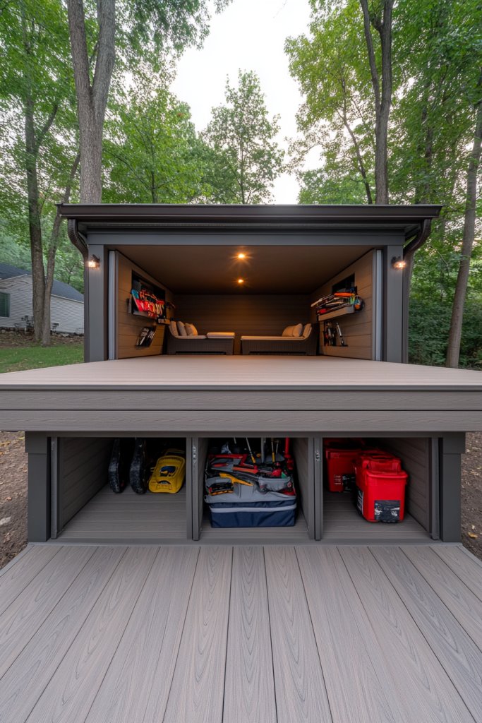 Begin with precise measurements and a stable foundation, especially if on uneven ground. Use weatherproof materials for the deck surface and supports. Install concealed access panels or drawers underneath, ensuring they are easy to open and close. Seal all joints and edges to prevent water infiltration. Add lighting for safety and ambiance, and keep the under-storage area organized with bins or dividers.