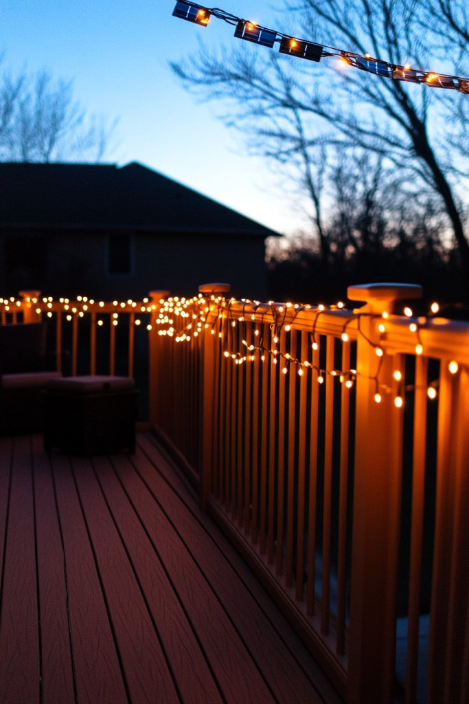 Picture delicate string lights draped casually across your deck’s beams or railing, casting a warm, inviting glow. The solar panels discreetly sit on the roof or nearby surface, powering the lights. During twilight, the soft illumination creates cozy zones for dining or relaxing. The gentle flicker of the lights highlights your decor and furniture, transforming your outdoor area into a nighttime retreat. The scene feels enchanting, relaxed, and effortlessly stylish.