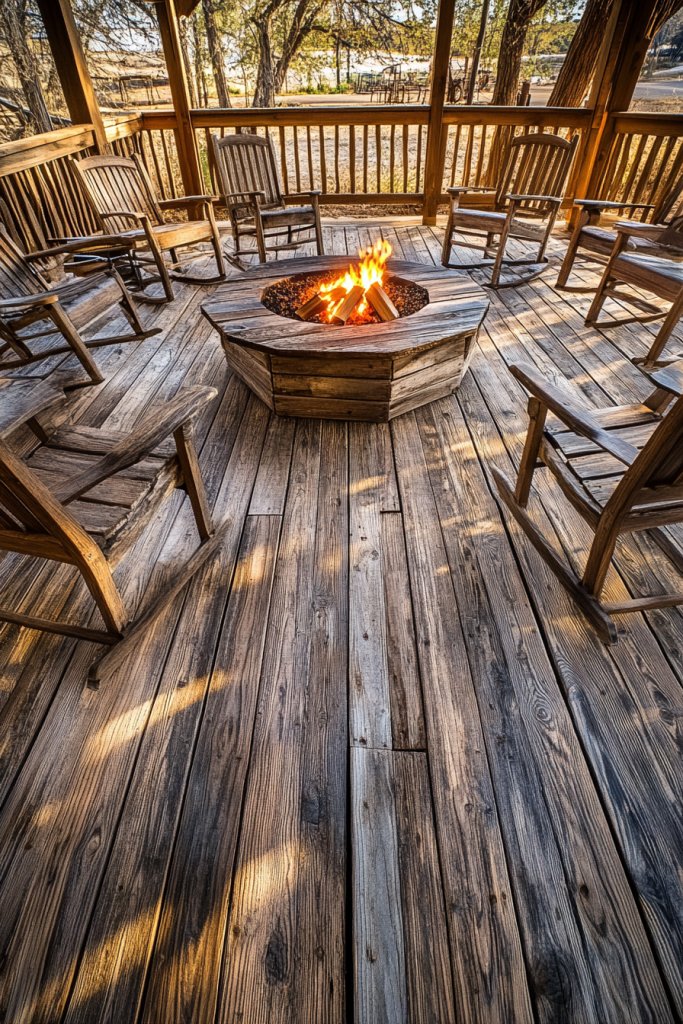 2. Rustic Wooden Plank Deck with Fire Pit Centerpiece