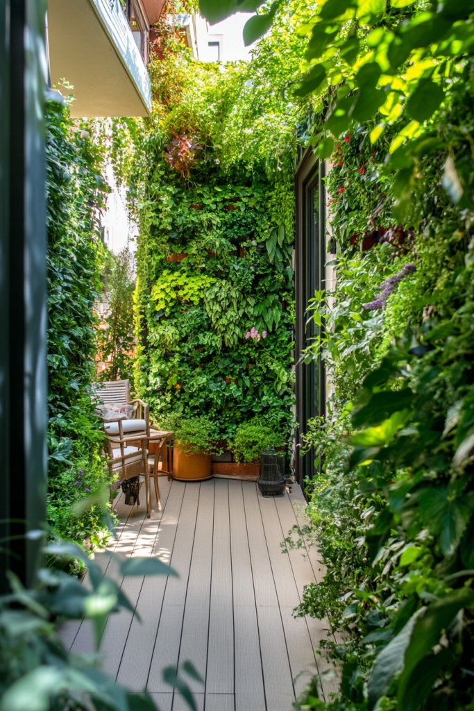 Imagine a sleek, modern deck with a vertical panel of living plants—herbs, succulents, or flowering plants—attached to a wall or fence. The lush greenery creates a vibrant backdrop, softening the hard edges of the deck. The plants appear to cascade, adding texture and depth. During the day, sunlight illuminates the leaves, casting lively shadows. At night, subtle LED lights highlight the green wall, transforming your yard into an urban oasis.
