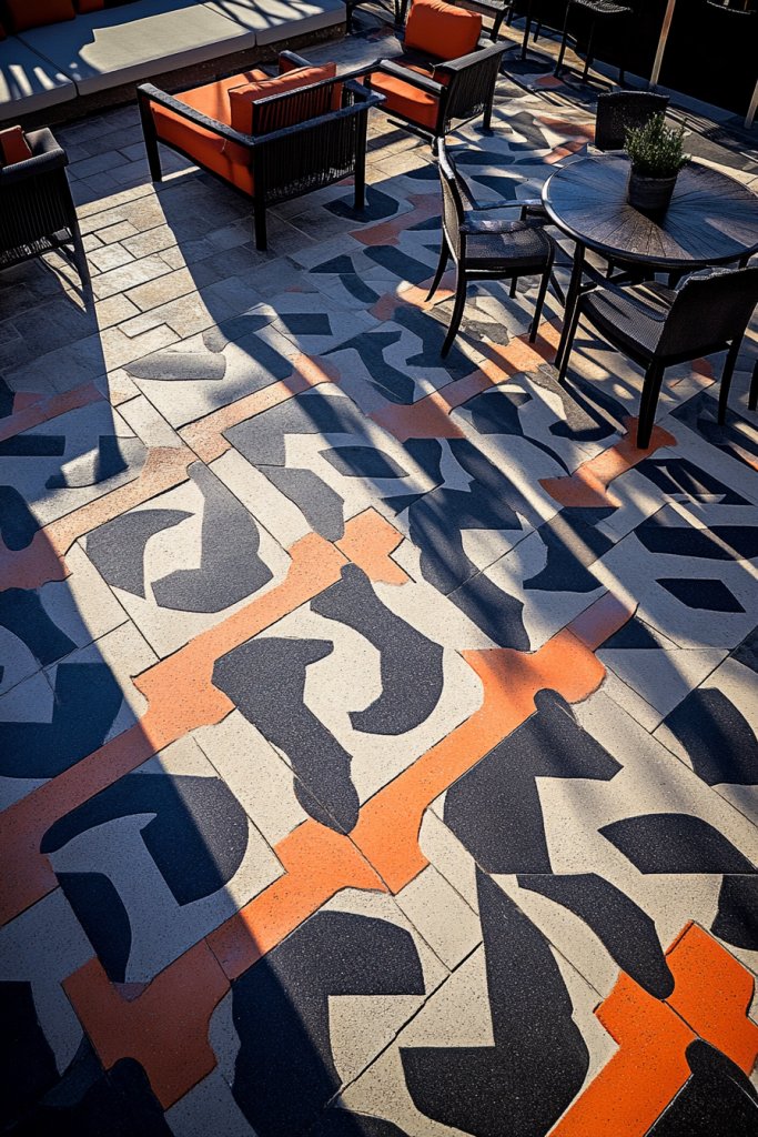 Picture a geometric mosaic of concrete pavers in contrasting colors—perhaps black and white or earthy tones—laid out in a mesmerizing pattern. The surface is textured, adding grip and visual depth. The pattern guides your eye across the space, leading to a cozy seating area or garden feature. The pavers sit flush with the ground, creating a seamless transition from lawn to lounge area. During sunset, the intricate design casts subtle shadows, adding to the visual drama.