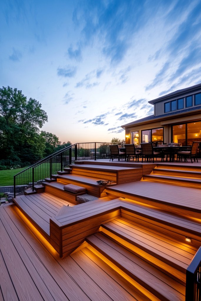 Imagine a two-tiered deck where the upper level hosts a dining table and the lower level features a cozy seating nook. The different heights create visual interest and define functional areas. Wooden steps connect the levels seamlessly, while planters or built-in benches add charm without clutter. The overall effect is a layered, inviting space that feels like an outdoor living room. During the day, sunlight filters through the multiple levels, creating playful shadows and highlights.