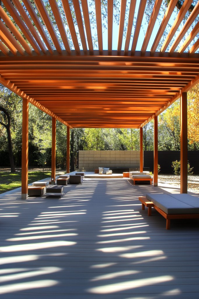 Envision a sturdy wooden pergola with climbing vines or fabric drapes that sway gently in the breeze. The deck underneath is furnished with comfortable lounge chairs and a small table, perfect for morning coffee or evening drinks. String lights or lanterns hang from the beams, casting a warm glow after sunset. The lattice pattern of the pergola creates interesting shadows, making the space feel cozy yet open. The overall look is rustic charm meets modern comfort.