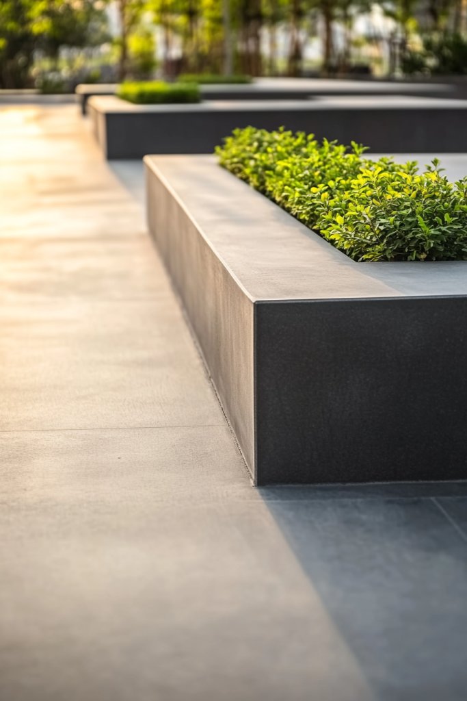 Visualize a smooth, light-gray concrete slab extending from your home, with rectangular or circular planters embedded along the edges. These planters are filled with carefully chosen plants—think succulents or low-maintenance greenery—that add a splash of life. The clean lines and uncluttered surface create a calming, spacious feel. Subtle lighting along edges enhances the sleekness at night, emphasizing the modern aesthetic.