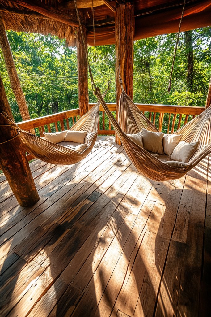 Source reclaimed wood from reputable suppliers or salvage yards, ensuring it’s treated for outdoor use. Lay the planks on a sturdy frame, securing with corrosion-resistant fasteners. Build hammock supports using weatherproof metal or treated wood, anchored securely into the deck structure. Finish with a weatherproof sealant to protect the wood and prolong its life. Add hooks and supports for the hammocks, ensuring they can handle weight safely.