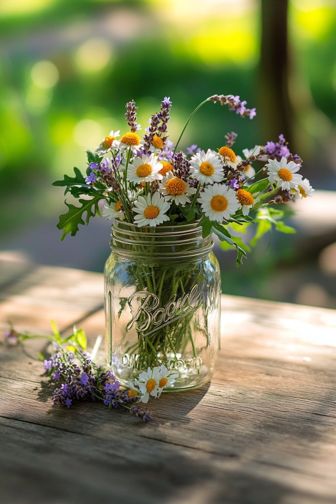 Imagine a collection of vintage glass mason jars, each filled with a mix of wildflowers in soft pastel shades, accented with sprigs of dried grasses. The jars sit casually on a wooden table, their imperfections adding character. The flowers sway gently with every breeze, filling the room with a subtle, sweet fragrance. Dried elements add texture, while mismatched jars bring a charming, eclectic look. It’s like capturing a slice of nature’s carefree spirit right at your table.