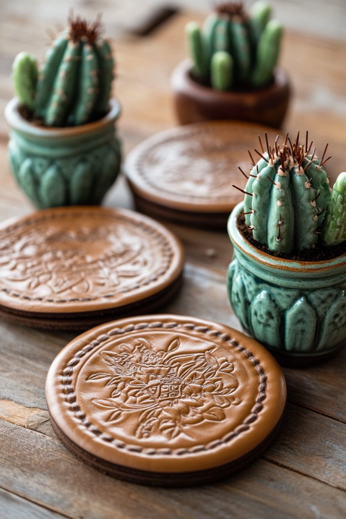 Customize with initials or special dates on the leather coasters for personalized gifts. Mix different cactus shapes and sizes for visual variety. Incorporate natural elements like small driftwood or stones to complement the design. Use colorful leather dyes or paints to match your event’s color palette. These coasters add subtle style and are easy to switch out for different seasons.