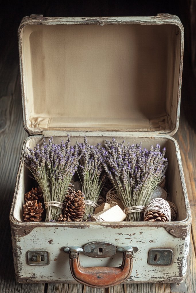 Start with a sturdy vintage suitcase—cleaned and lightly distressed. Fill the interior with dried lavender, securing it with twine or floral wire if needed. Add small decorative elements such as mini figurines, antique keys, or rustic candles. Arrange the items thoughtfully to create depth and visual interest. You can elevate the suitcase on a stand or place it directly on a table. For extra aroma, include a few fragrant dried herbs.