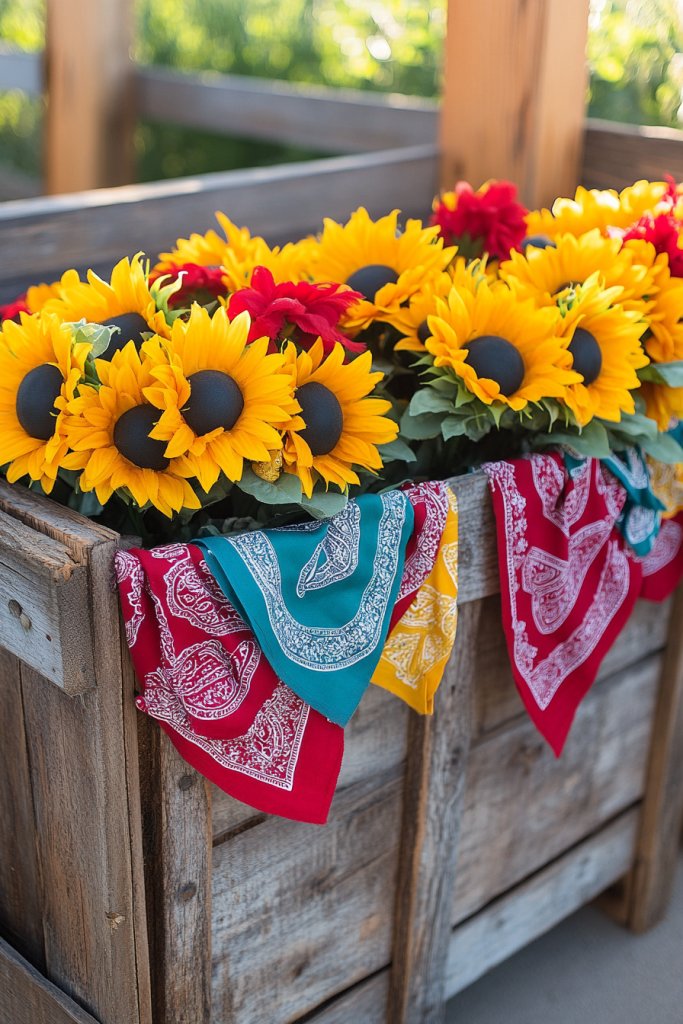 12. Wooden Crate Display with Faux Sunflowers and Bandanas