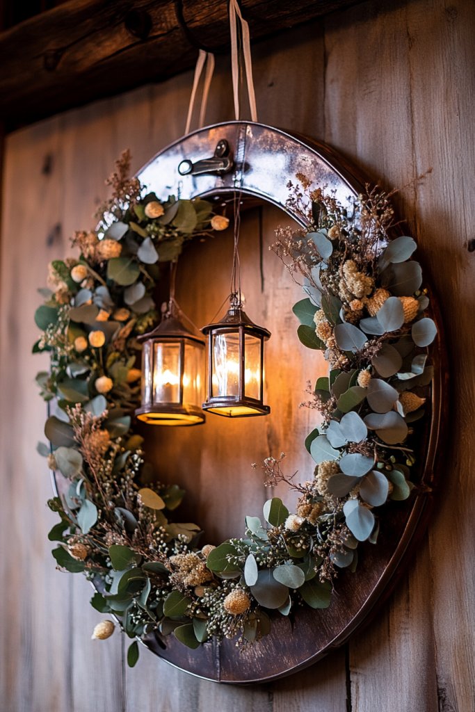 Envision a large horseshoe mounted on a wall or stand, decorated with dried grasses, seed pods, or faux floral accents woven into the shape. Small lanterns hang from the horseshoe’s points, casting a warm, flickering glow. The wreath feels alive with texture, blending rugged metal with delicate natural elements. Ambient lighting enhances the intricate details, creating a cozy, welcoming scene that evokes frontier festivities and country gatherings.