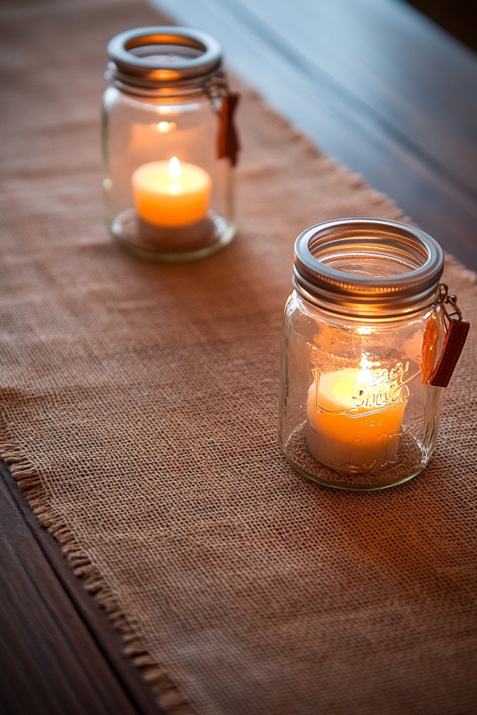 14. Burlap Runner with Mason Jar Lanterns and Leather Accents
