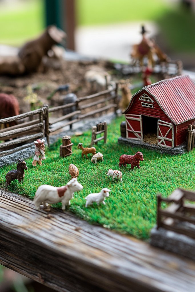 Visualize a small, faux grass mat serving as the landscape, dotted with miniature barns, fences, and tiny cow or horse figures. Little hay bails or wooden signs complete the scene, while faux animals add lively details. The setup feels like a tiny, bustling ranch, full of personality and charm. Bright colors or weathered finishes enhance the rustic appeal, making it inviting and playful. It’s like creating a miniature farm world that guests can’t help but smile at.