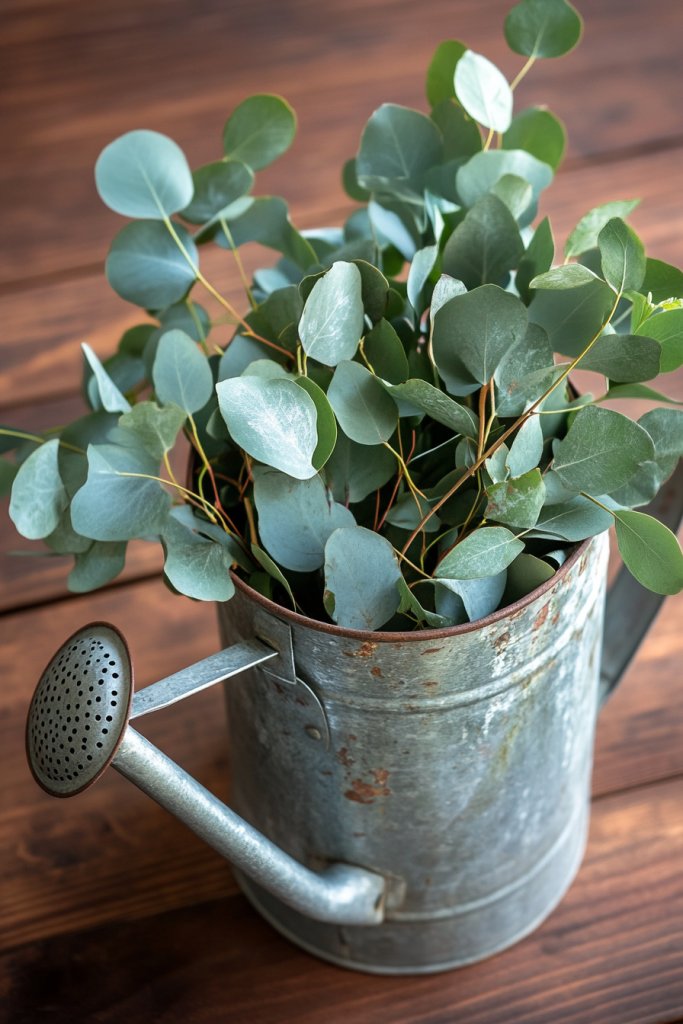 Picture a weathered tin watering can with a long spout, overflowing with sprigs of eucalyptus—either real or faux. The green leaves cascade down, contrasting beautifully with the can’s aged metal surface. Surround it with other rustic elements like wooden trays or vintage signs, creating a cozy, farm-inspired scene. The aromatic eucalyptus adds a subtle scent, enhancing the sensory experience. It’s a versatile, nature-inspired focal point.