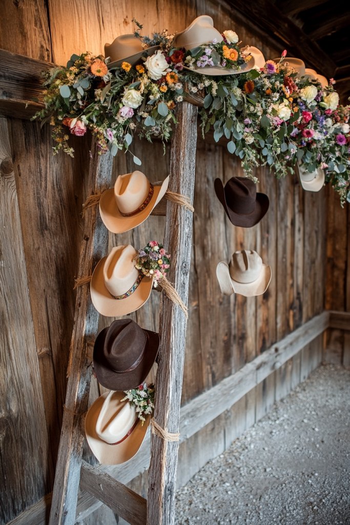 17. Old Wooden Ladder with Hanging Cowboy Hats and Floral Garlands