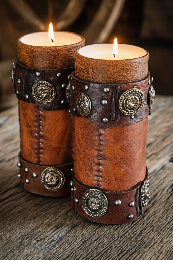18. Leather-Coated Candle Pillars with Western Embellishments