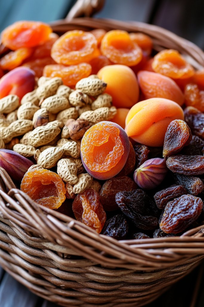 Imagine a woven wicker basket overflowing with dried apricots, figs, walnuts, pecans, and cranberries. The natural tones of the dried fruits and nuts contrast with the woven texture of the basket, creating a cozy, abundant scene. Small sprigs of cinnamon or star anise add aromatic appeal and visual interest. The arrangement feels rustic and inviting, like a farmer’s market display or a harvest festival centerpiece. It’s a feast for the eyes and senses.